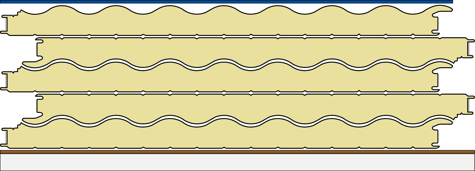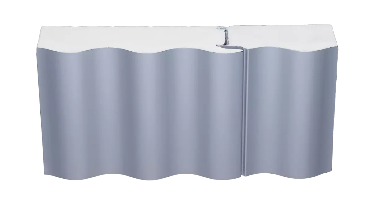 This sandwich panel with a sinus-corrugated external sheet and hidden fixing is a great esthetical option for modern facades by giving them a lively touch with its original wave design. The highly heat-insulating CFC-and HCFC-free polyurethane rigid foam core is suited best for today's requirements for thermal insulation and moisture protection. A non-displaceable sealing strip foamed into the longitudinal joint procures resistance to driving rain and wind. Together with the organic coating of the steel sheets, this ensures efficient protection against all kinds of weather.