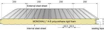 The Monowall® panel with polyurethane insulation core is suitable for both vertical and horizontal installation. Its special surface profile facilitates the installation of the panel without the risk of bulging. The appearance of the external side benefits distinctly from the screw head applied in the recess of the profile.