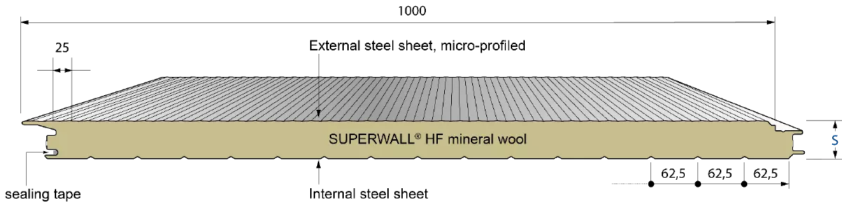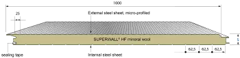 The Superwall® HF sandwich panel with a micro-profiled external steel sheet, a non-combustible mineral wool core and a joint-geometry for hidden fixing is suited best to meet today’s sophisticated requirements for high-quality façades. The panels can be placed vertically or horizontally and - depending on the insulation thickness - may reach a fire resistance up to 90 minutes.
